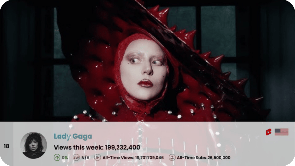 On YouTube, that mix of high art and high camp was an instant hit. The official music video for “Abracadabra” picked up more than 28 million views within seven days, bringing Gaga’s primary channel to a total of 199.2 million weekly views. That was enough traffic to bump her up to 18th place in the U.S. Top 50.